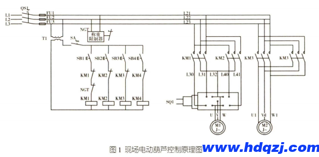 (2)控制電動葫蘆上升的接觸器KM1故障吸死。其控制按鈕SB1及啟動開關(guān)SA均無法切斷電動葫蘆上升的電源,導(dǎo)致事故的發(fā)生。